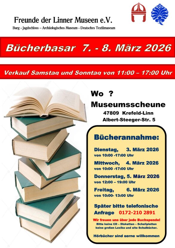 Im April fand der Büchermarkt des Vereins „Freunde der Museen Burg Linn“ in der Museumsscheune in Krefeld-Linn statt. „Unsere Arbeit hat sich gelohnt“, lässt der Vorsitzende Günther Busch wissen, „Das Ergebnis von Verkäufen, großzügige Spenden für Kaffee und allgemeine Einnahmen in Höhe von 6.900,00 € ist erfreulich und ein Rekordergebnis.“